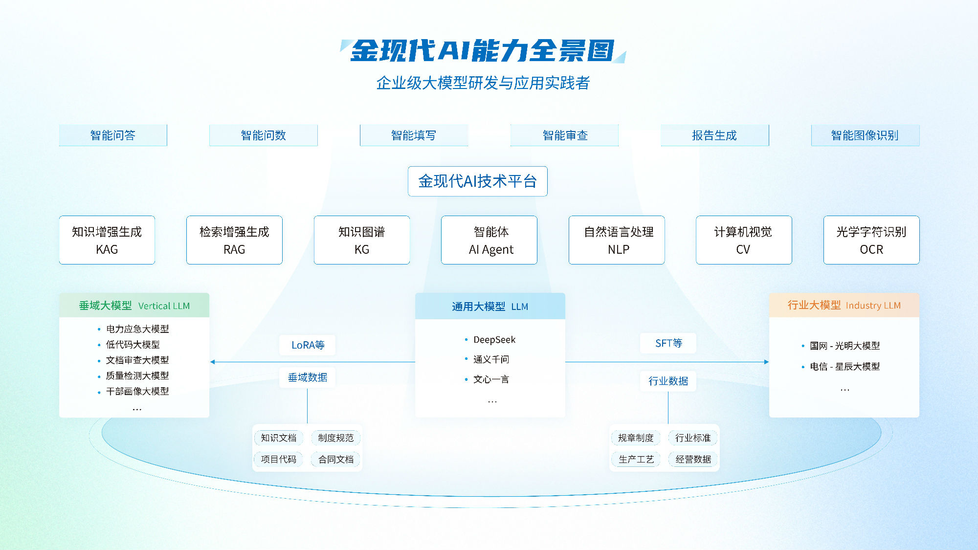 為更好地推動企業(yè)級大模型的落地應用,金現(xiàn)代構建“AI產品+核心組件+咨詢服務”三維賦能體系,依托公司在十余個行業(yè)、近百個場景中的應用案例,為企業(yè)提供從“AI能力建設”到“場景化落地”的全生命周期解決方案。
