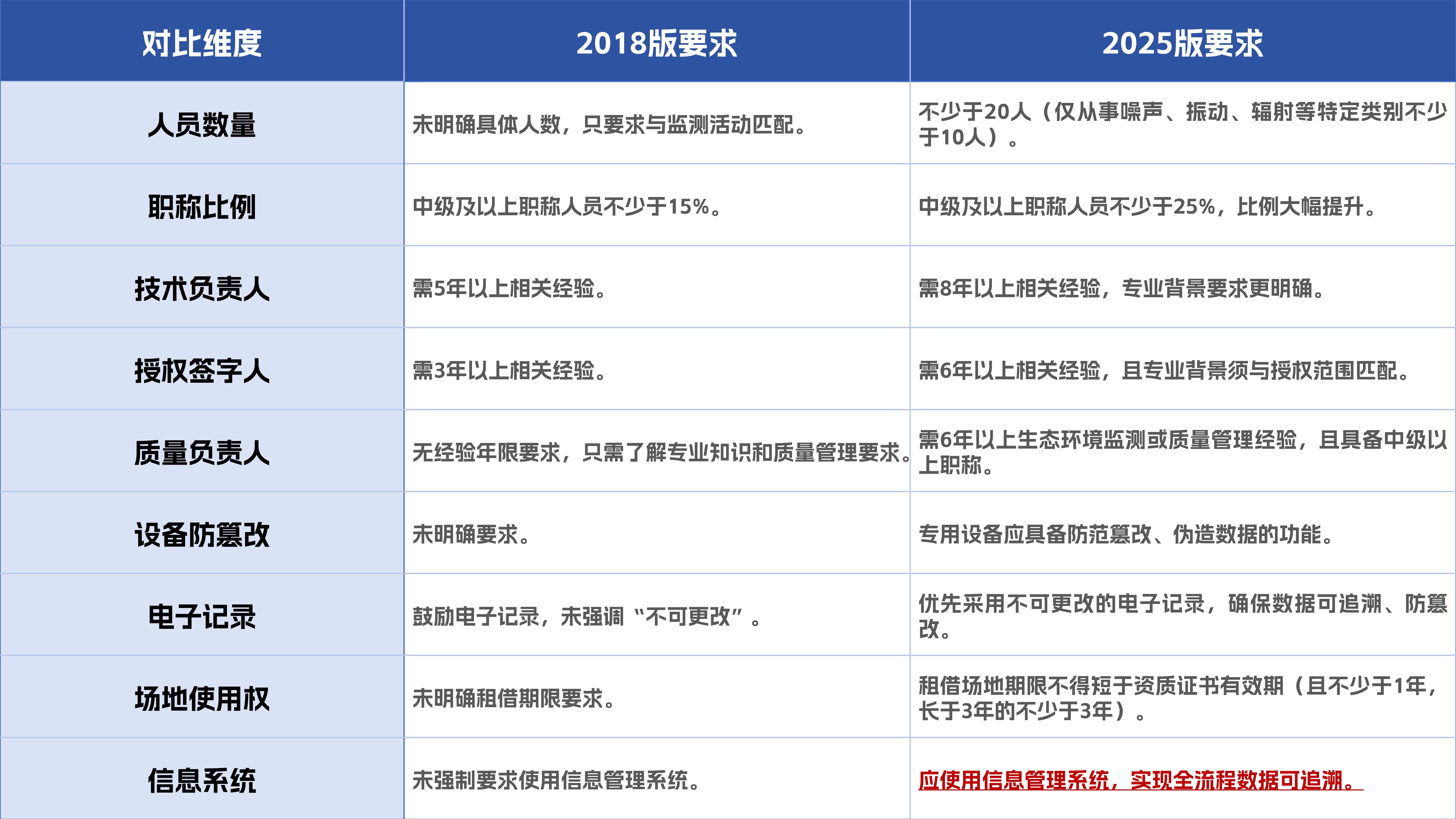 關(guān)鍵崗位經(jīng)驗加碼:技術(shù)負(fù)責(zé)人、授權(quán)簽字人、質(zhì)量負(fù)責(zé)人的從業(yè)經(jīng)驗要求分別提升至8年、6年、6年,且需簽訂正式勞動合同。